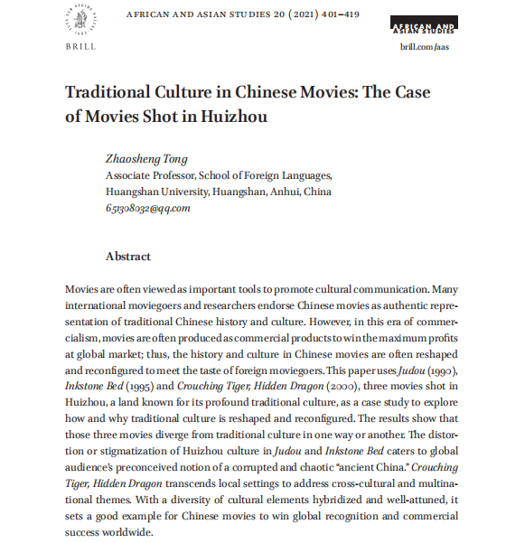 近日,9778818威尼斯教师童兆升副教授在世界老牌知名出版社博睿(Brill Academic Publishers)旗下的学术期刊African and Asian Studies上发表论文Traditional Culture in Chinese Movies: The Case of Movies Shot in Huizhou。该杂志致力于发表有关亚洲和非洲国家社会、文化以及全球社会变化和发展动态的文章、研究笔记和书评。该论文发表实现了该院教师在SSCI期刊论文发表零的突破。